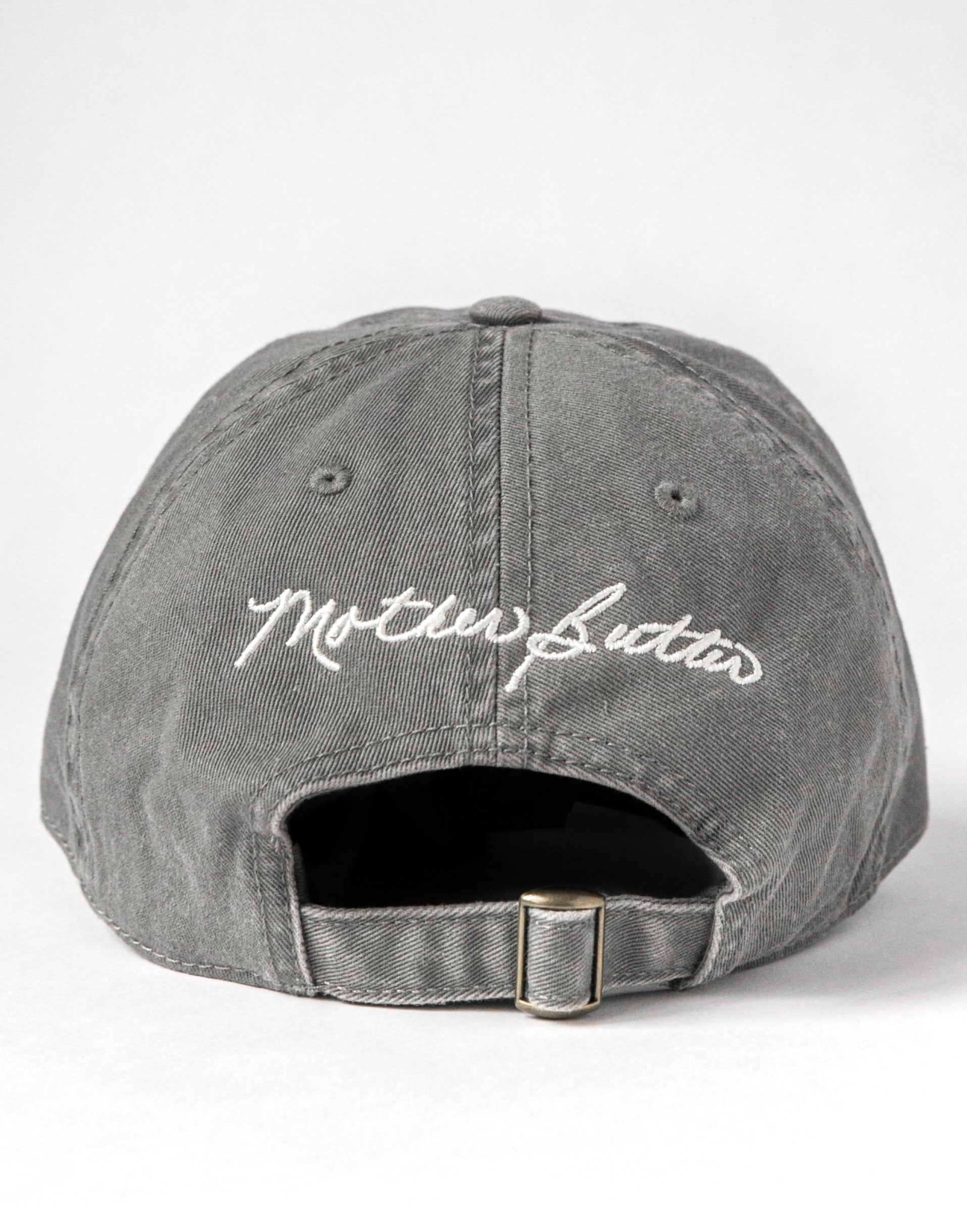 Washed chino twill with fabric strap + antique sliding brass buckle. Front embroidery is our 4-seed logo + back is the "Mother Butter" script logo.